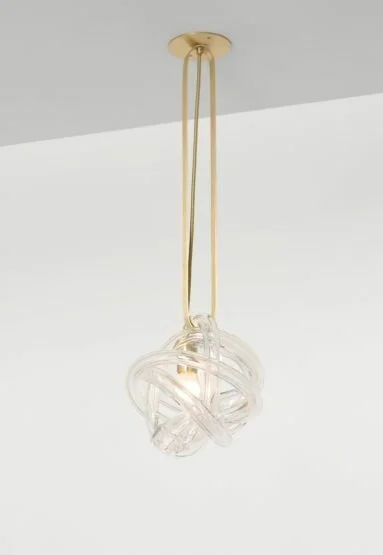 A SkLO large wrap is suspended from a brass "pin", made of a continuously curved brass bar. The "pin" overlaps at the bottom, allowing for removal of the glass element. The socket is housed in a brass cup, hung independently on its own exposed fabric-wrapped electrical cord, suspending the bulb within the large wrap glass element. Handblown glass, no two exactly alike.