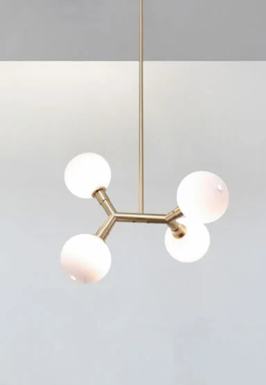 The veer pendant consists of four lit spheres of handblown Czech glass mounted on a four-arm brass structure and suspended on a rigid brass stem. The glass is available in two sizes - 4 1/2" (11cm) or 7" (18cm) in diameter - and five glass colors. The glass features the signature SkLO double-dipped, fire-polished mouths which show where the glass is broken from the blower's pipe, making each unique.