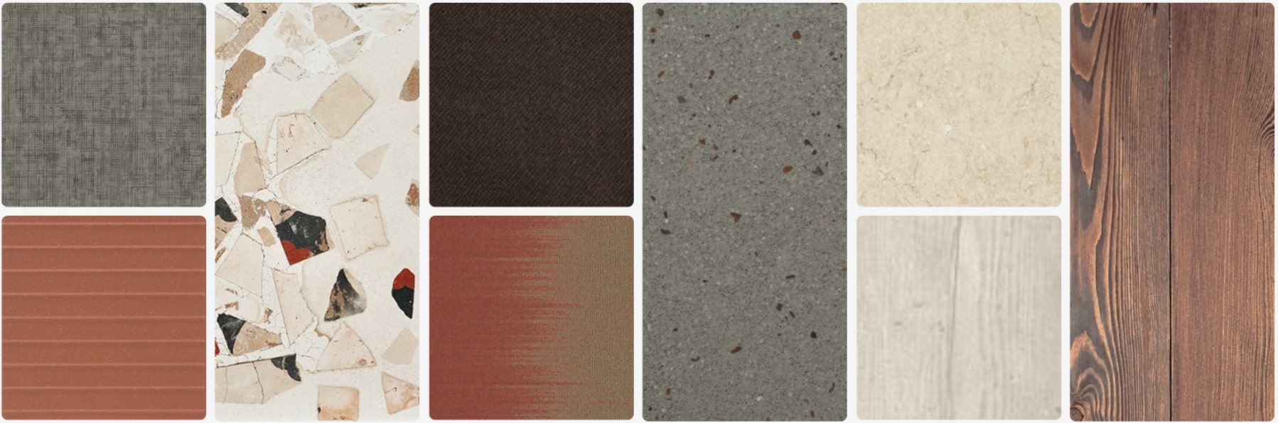 As the focal point of this collection, the large chip terrazzo tile is what ties all the elements together. Shades of cream, grey, and brown are utilized to complement the beautiful terracotta colors, and the flecked concrete material is a subtle accent to the terrazzo tile.