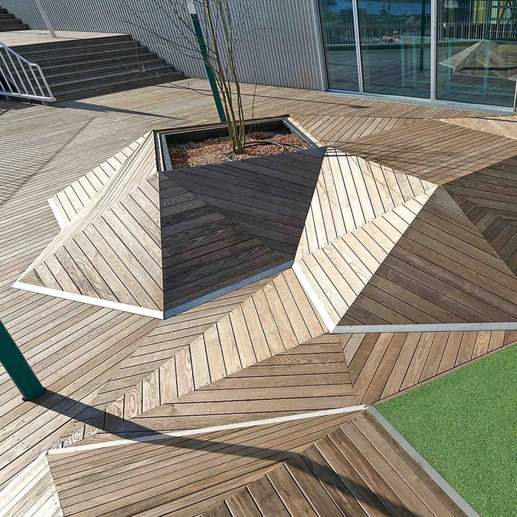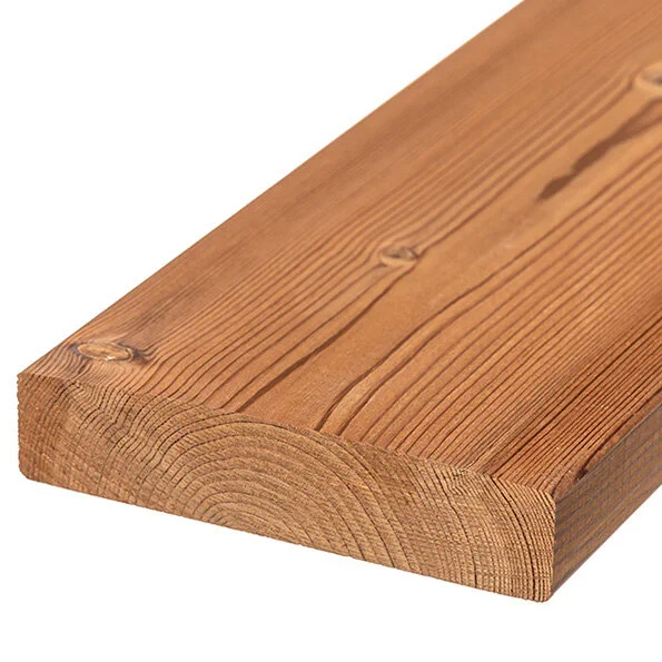 This thermally modified Scots Pine Decking from Thermory features distinct knots, beautiful golden brown color (or, let it naturally age to stunning silver!), and no visible sapwood.